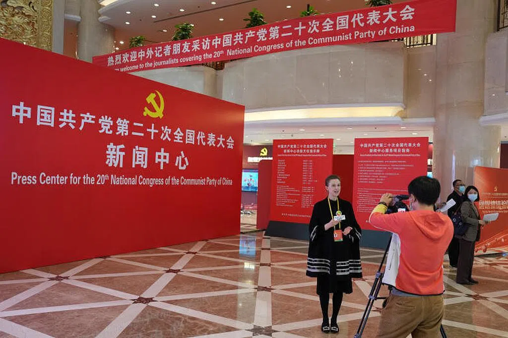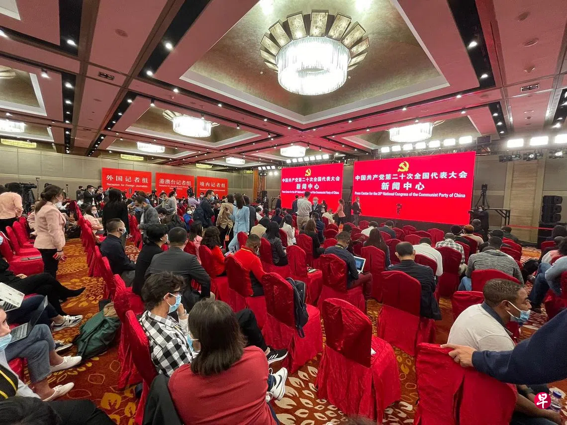 中共二十大首场新闻发布会开始前一个半小时,约300多名中国国内外媒体记者已在设于北京新世纪日航饭店的分会场等候。现场以红色为主题布置,并播放《喜洋洋》《步步高》等轻快的华乐曲。