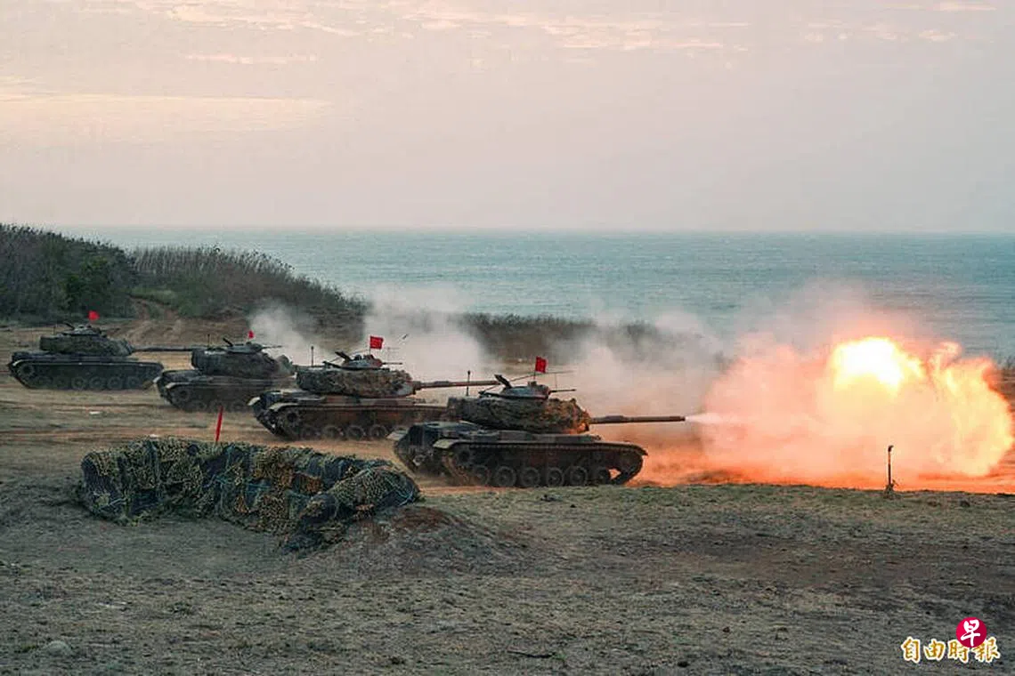 报道称,澎防部“镇疆操演”共分为四个阶段,首先,面对敌军空中兵力,部队先实施“短程防空作战”,先以迫击炮发射照明弹,随后刺针防空飞弹模拟射击,搭配防空机炮组织的火网进行打击,再紧接进行“滩岸火歼”、“滩岸战斗”、“反击作战”三阶段,炮兵部队发射完毕后立即转移阵地,M60A3战车、CM21装甲车部队也朝滩岸挺进,集火对海射击。