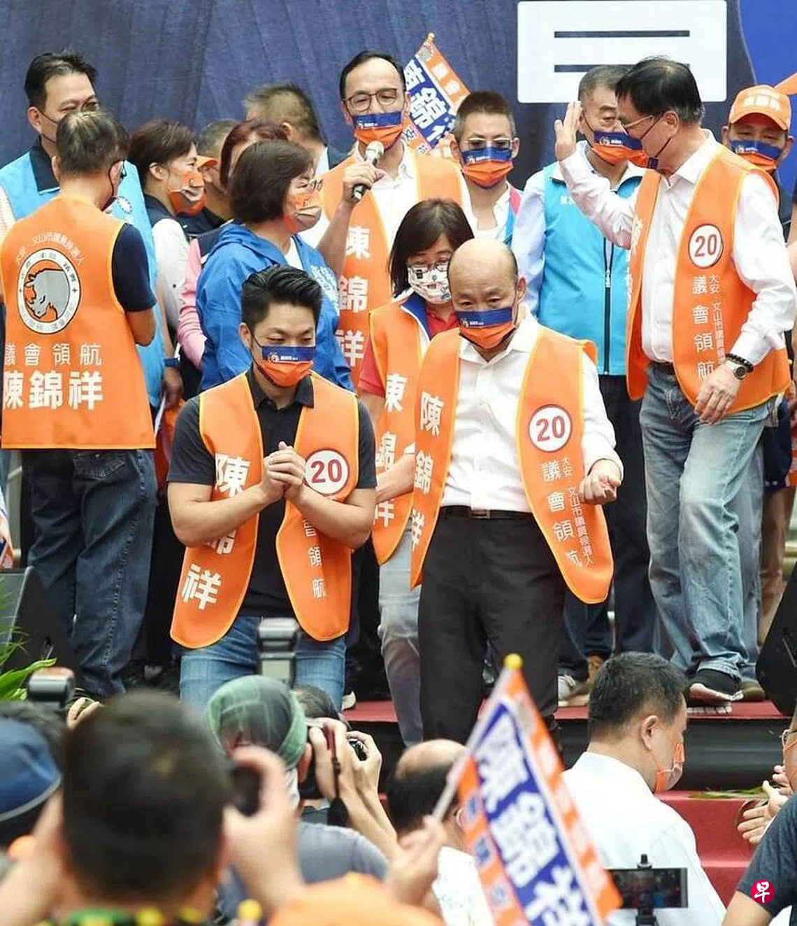 台湾“九合一”地方选举进入倒数阶段,国民党籍台北市议长陈锦祥举办竞选总部成立大会,前高雄市长韩国瑜与国民党台北市长候选人蒋万安首度同台造势。