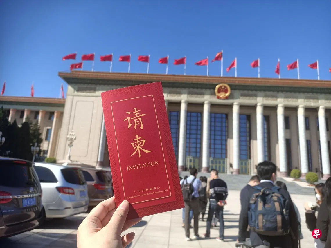 中共二十届政治局常委将在星期天(10月23日)中午会见中外记者,数百名记者提前一个多小时抵达人民大会堂。