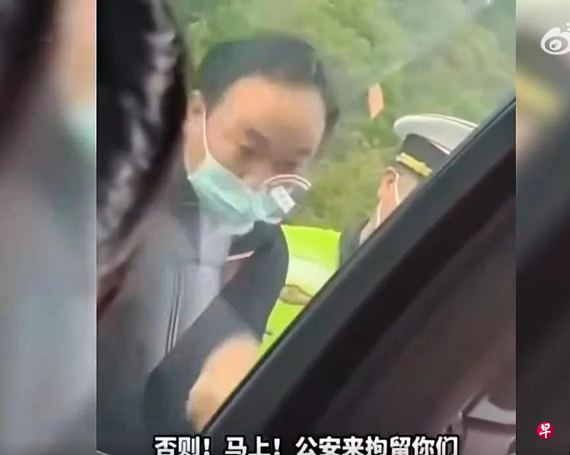 视频中,李先凯佩戴口罩站在车门外,对车内的人说:“回去!离开!不准在这儿!否则马上公安来拘留你们!”“你不是我们这儿的人,你到我们这来干啥!”