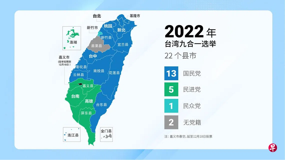 台湾在星期六(11月26日)举行九合一地方选举,目前21个县市选举结果全部出炉,国民党拿下13席,民进党拿下五席,民众党赢得一席,无党籍参选人拿下两席。