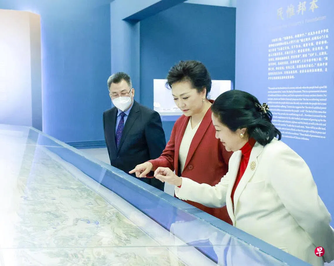 据报道,彭丽媛与丽莎一同参观了由中国国家博物馆和故宫博物院联袂推出的“和合共生——故宫·国博藏文物联展”。展厅陈列的青花开光花鸟图菱花口折沿盘等400余件中国历代文物藏品,展现了中华文明深厚的历史底蕴和中华民族“尚和合、求大同”的价值追求。