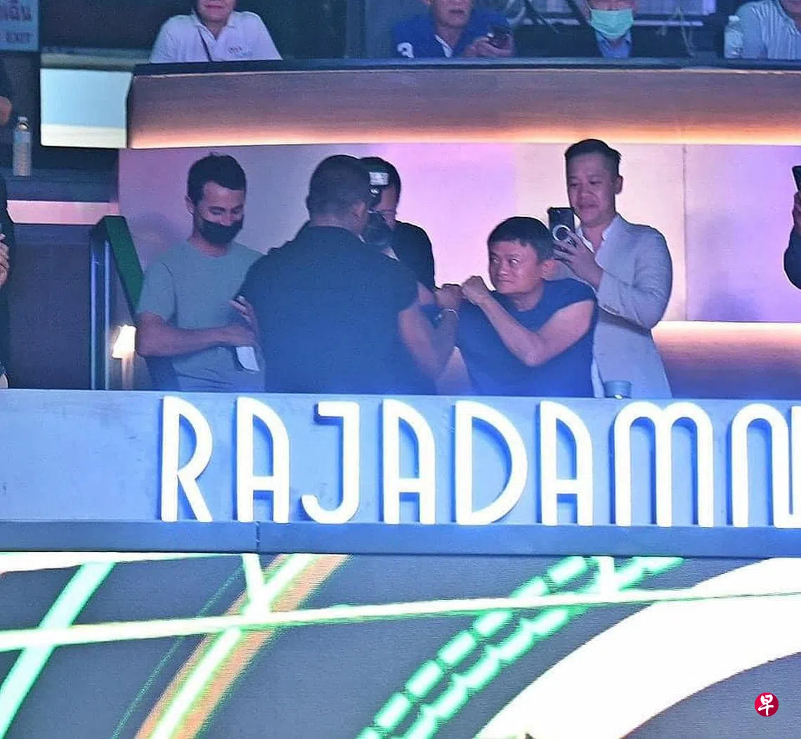 据泰国《民族报》星期五(6日)报道,中国亿万富豪马云5日现身曼谷Rajadamnern泰拳赛馆观战。他看似坐在贵宾区,被拍到摆出要与泰国传奇泰拳选手班差迈(Buakaw Banchamek)过招的架势。