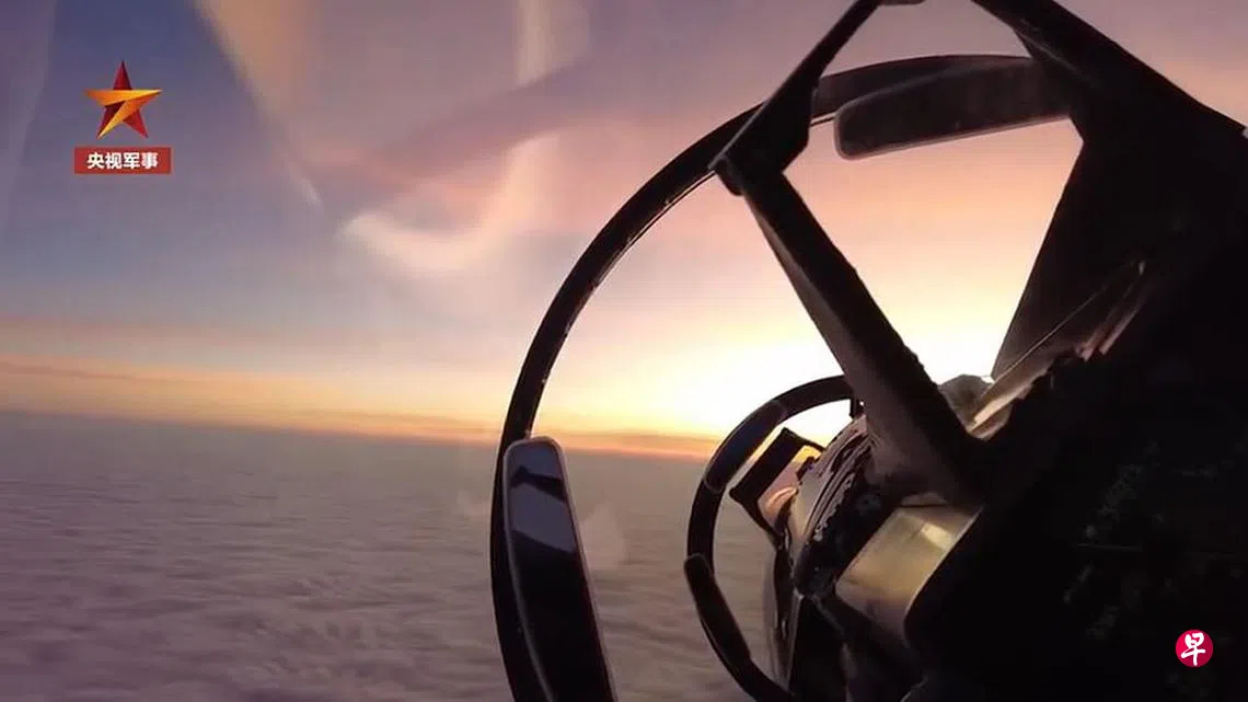 中国官媒播出解放军战机农历新年第一天在南中国海空域跟监外机的视频画面。