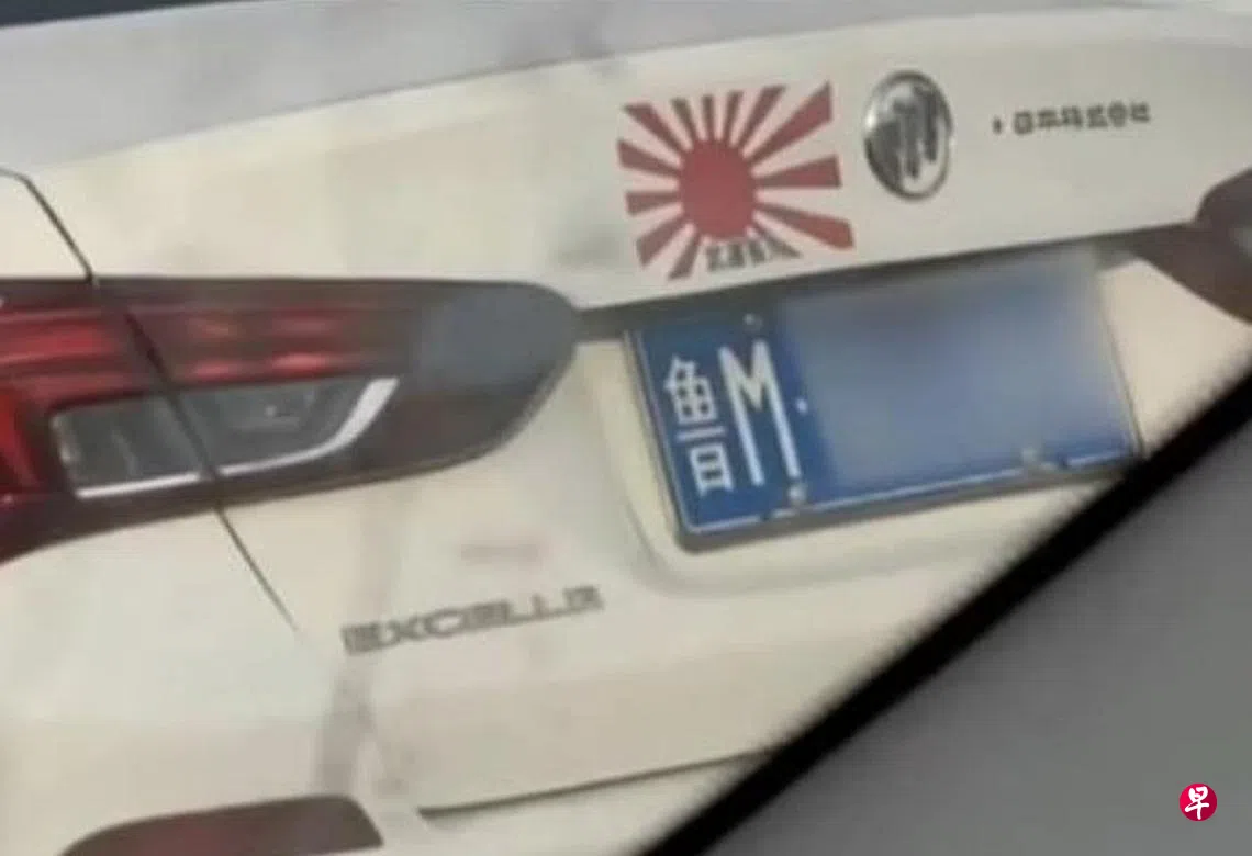 网民拍摄的视频显示,这辆行驶中的别克轿车尾部除了张贴旭日旗,旗帜下方还写着“武运长久”四个字。