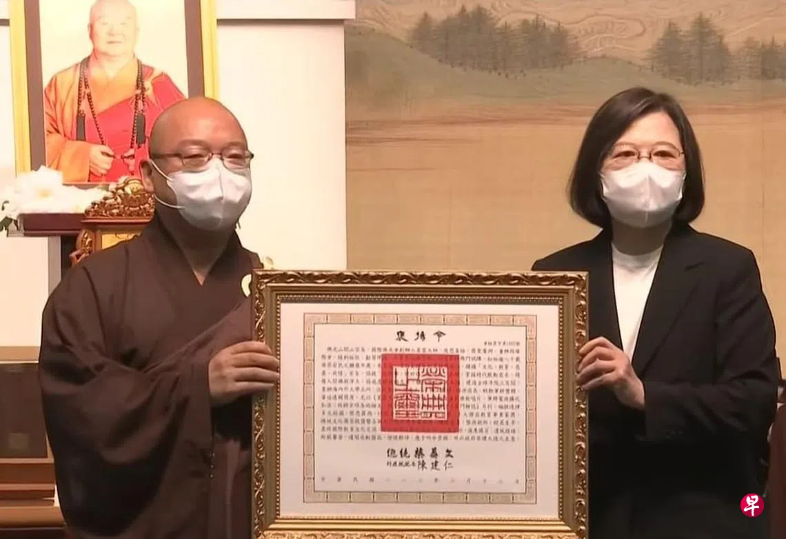 蔡英文在现场向星云法师颁发褒扬令,陈其迈则颁发荣誉市民证书。陈建仁献花、行三鞠躬礼致意后离开,准备前往左营视察一座运动训练中心。