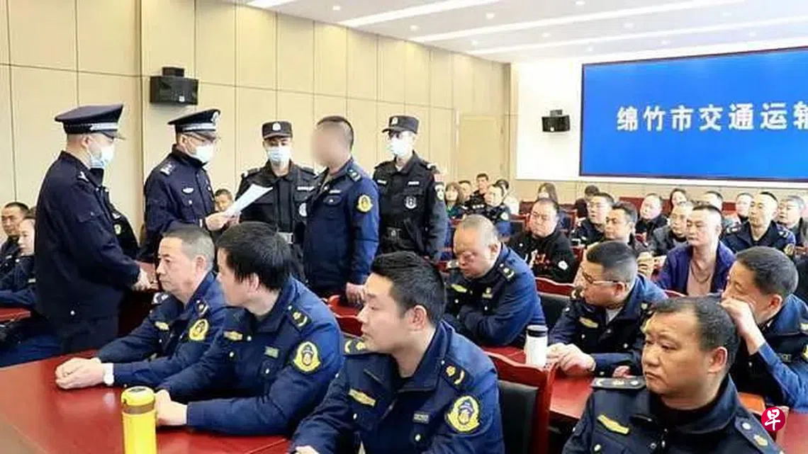 四川绵竹市交通运输局日前召开警示教育大会。有纪委监委官员向在场的60多名交通执法人员公开宣布,指一名执法人员涉嫌受贿罪,当场将他扣上手铐带离现场。