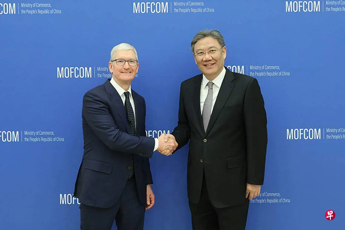 中国商务部公布,商务部部长王文涛星期一(3月27日)会见苹果公司首席执行官库克。双方就苹果在华发展、稳定产业链供应链等议题进行了交流。