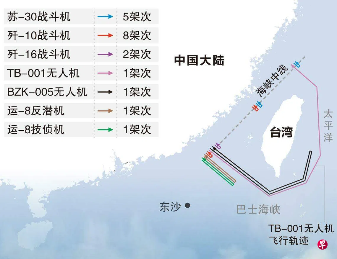 根据台湾空军公布台海周边空域活动示意图,五架次苏恺30战机及两架次歼16战机逾越海峡中线,八架次歼10战机、一架次运8反潜机、一架次运8技侦机侵扰西南空域,一架次BZK-005无人侦察机从西南空域航经南方至东南空域,一架次TB-001无人机从西南空域航经南方并延伸至东部,再进入东北空域飞返中国大陆沿海。