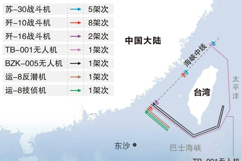 除在星期四(27日)上午6时至星期五(28日)上午6时派出一架TB-001无人机近乎环绕台湾飞行外,大陆解放军还派出38架次军机,其中19架次逾越海峡中线及其延伸线进入台湾西南、东南及东北空域,以及六艘次军舰,持续在台海周边活动。