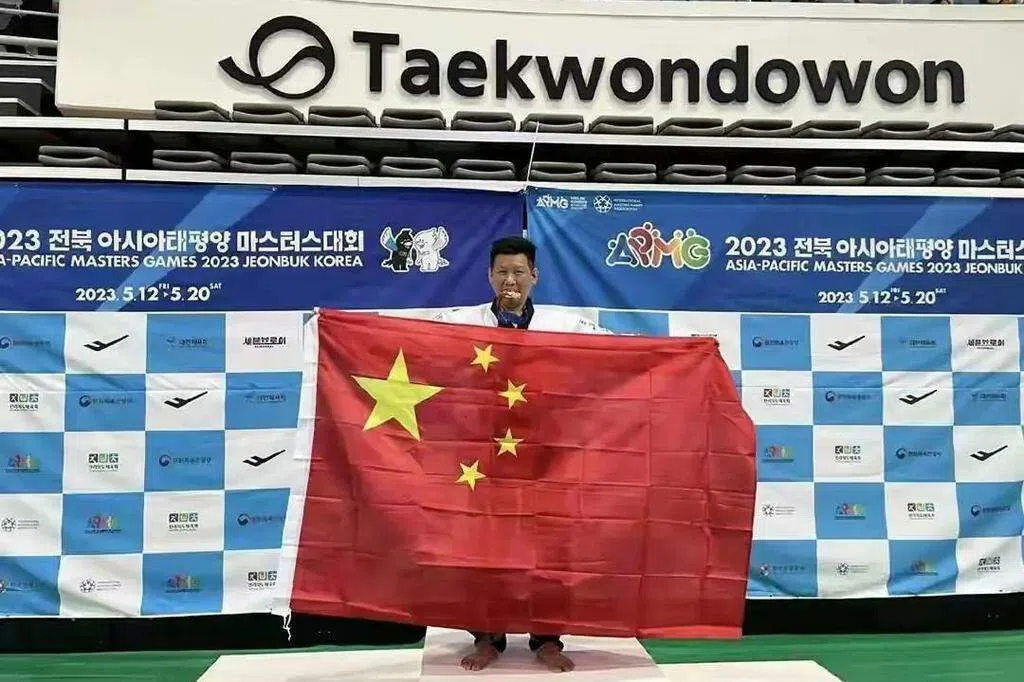 台跆拳道选手领奖时举五星旗