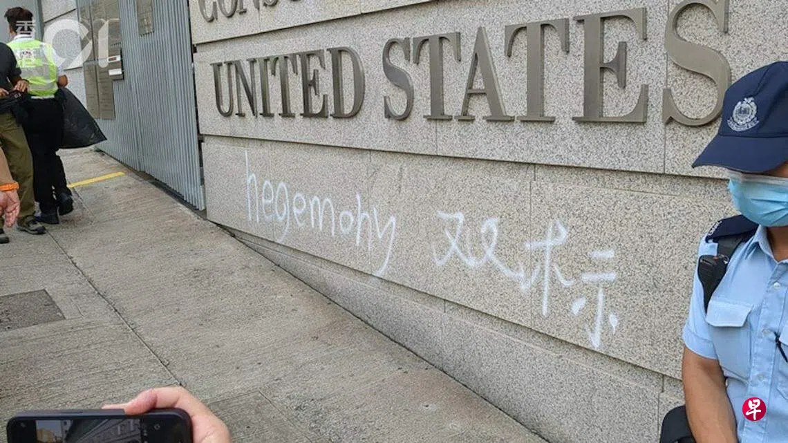 综合《星岛日报》和网媒“香港01”报道,位于香港中环花园道26号的美国驻港澳总领事馆外墙和大闸星期二凌晨被人用白色油漆喷上文字,香港警方凌晨5时接获报案,到场后发现领事馆的外墙和大闸被人用喷上“Hegemony(霸权)”及“双标”等文字。