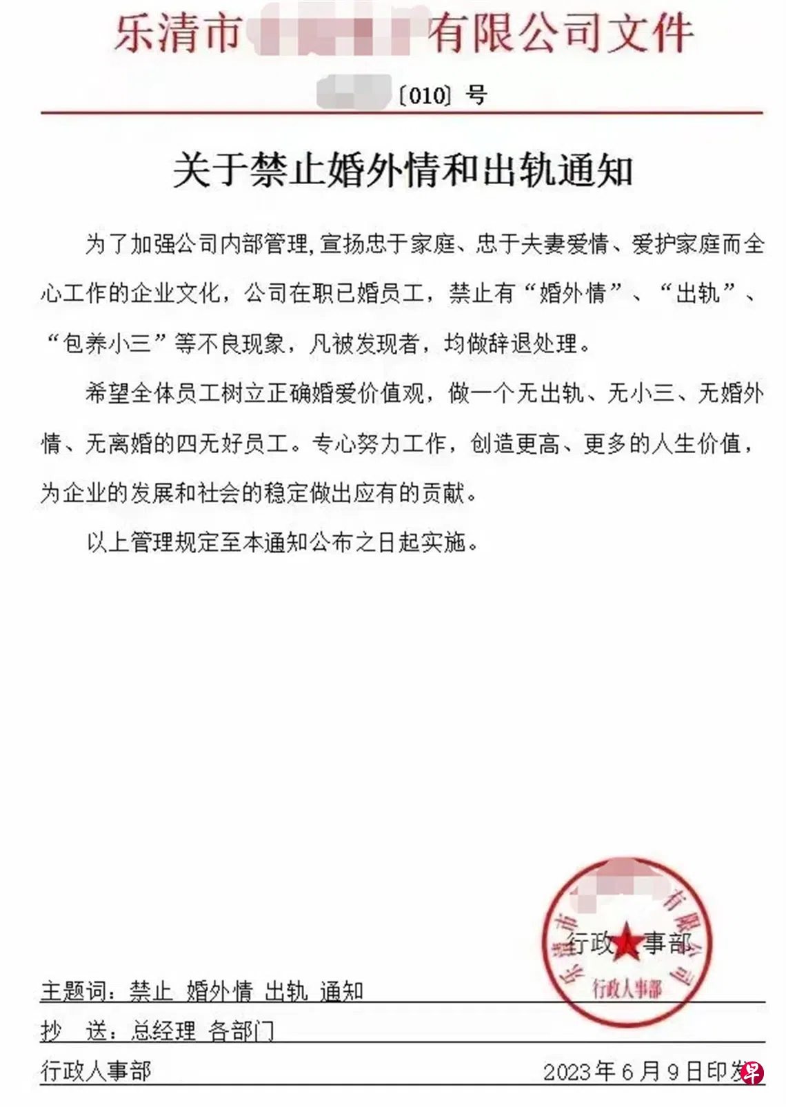 公司也呼吁全体员工“树立正确婚爱价值观,做一个无出轨、无小三、无婚外情、无离婚的四无好员工。专心努力工作,创造更高、更多的人生价值,为企业的发展和社会的稳定做出应有的贡献。”这份通知由企业行政人事部2023年6月9日印发。