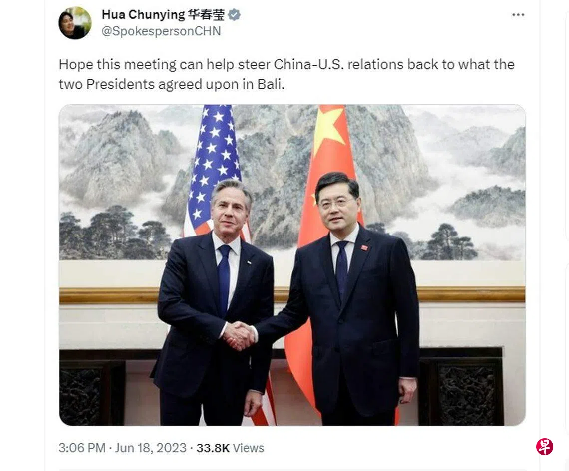 中国外交部部长助理、发言人华春莹在社交平台上传中美外长在北京会谈前握手的照片,并发文称期望此次会面能让中美关系,回到两国元首在去年峇厘岛会晤时达成的共识。