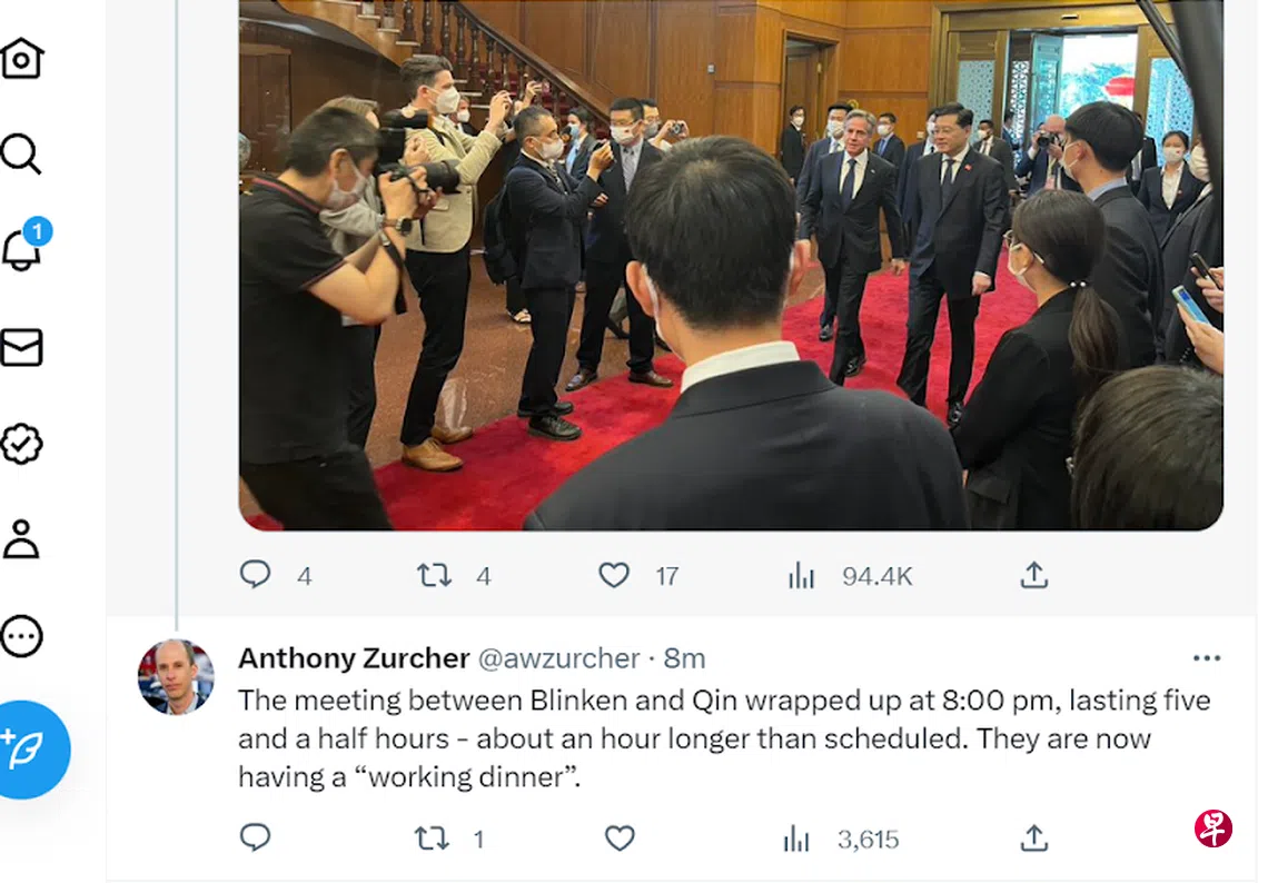 据路透社报道,美国国务院发言人说,布林肯与秦刚的会谈持续了五个半小时,之后两人进行工作晚餐。发言人没有提及两人会谈的时间比原定时间还长。