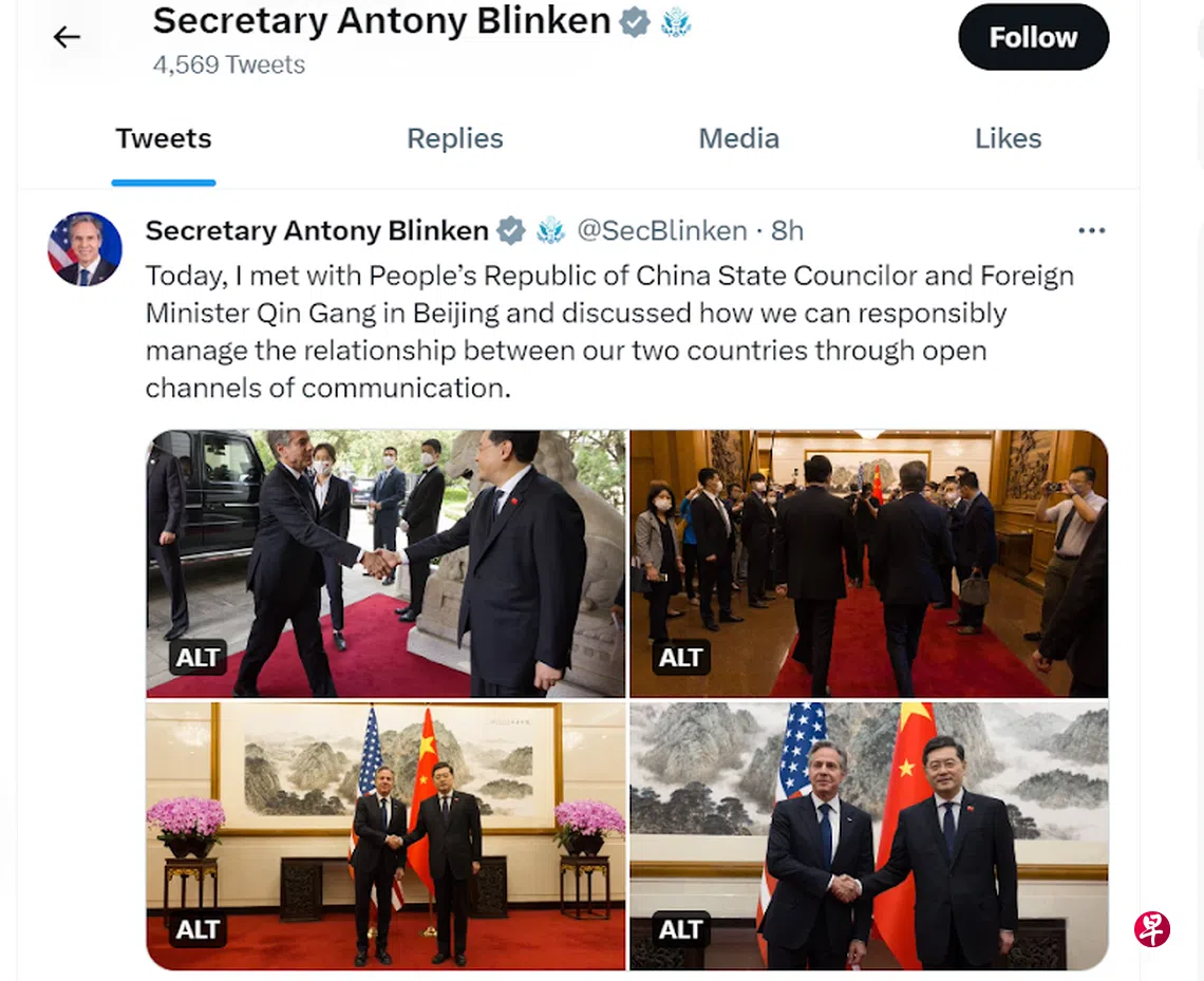 布林肯在推文中附上多张与秦刚的合照,其中包括他与秦刚在中美国旗前握手的照片。