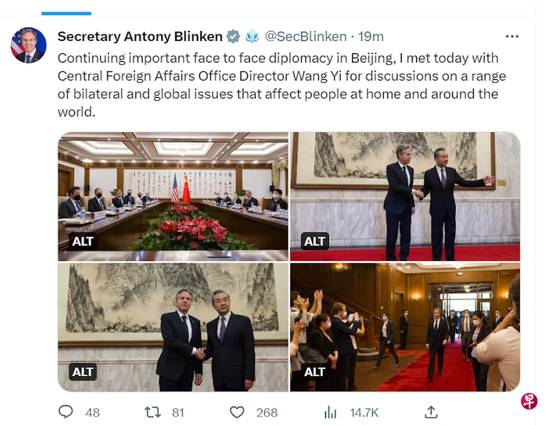 美国国务卿布林肯星期一(6月19日)上午与中共政治局委员、中央外事工作委员会办公室主任王毅会谈后,下午在社交媒体推特发文说,他继续在北京进行重要的面对面外交,并称与王毅讨论了一系列影响国内外人民的双边和全球议题。