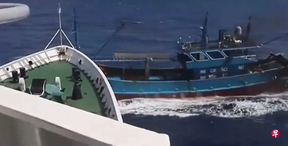 经多次恶意撞击后,一艘海警舰艇桅杆断裂、护栏变形,该渔船因右舷围挡部分破裂进水、被迫停船。执法员把握时机,迅速登检控制该渔船和船上就名人员。随后,海警执法人员帮其排水堵漏并押解返港。