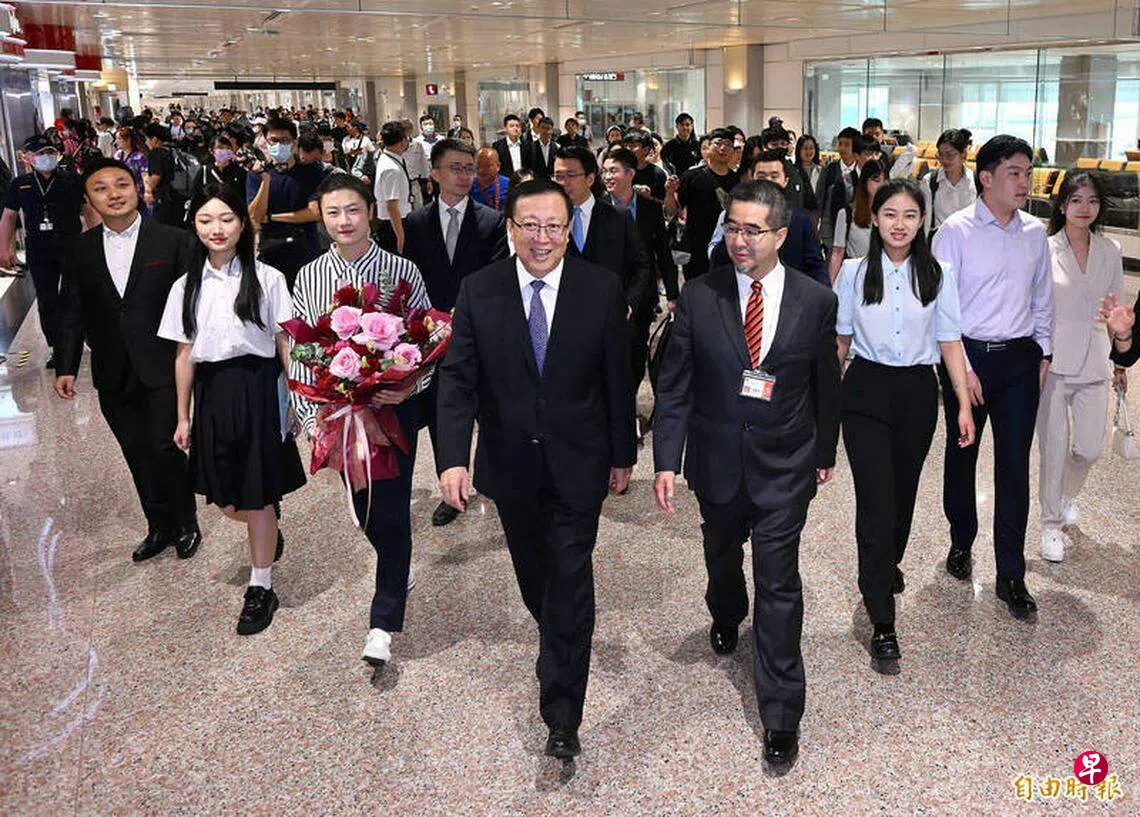 访问团一行星期六(7月15日)早上搭乘国航CA185班机从北京出发,上午11时36分抵达桃园机场,代表接机的萧旭岑献花给率先下机的郝平表示欢迎;团员在专人引导下通关入境并提领行李后搭车离去,全程并未受访。