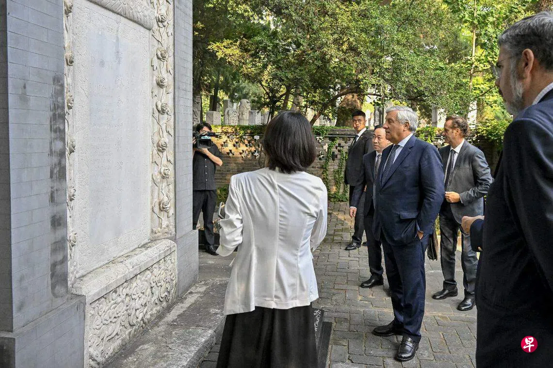 意大利副总理兼外长塔亚尼飞抵北京首日,参观了意大利传教士利玛窦位于北京的墓碑。