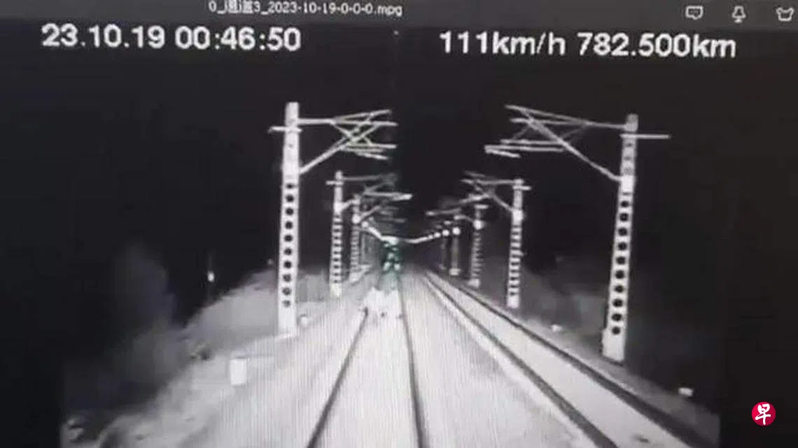 网传监控视频显示,K996次列车在行驶途中,时速保持在111公里。零时46分,列车正前方的轨道内出现两个人影,人影随着列车驶过消失。视频显示,列车随后明显减速。