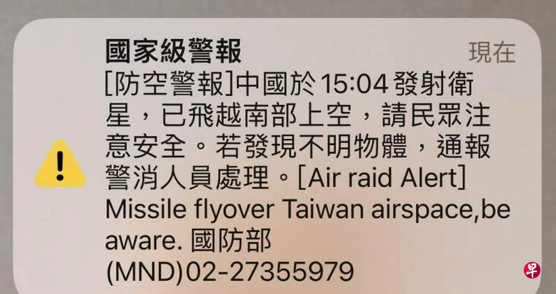 台湾国防部星期二下午两度以中英文形式发出上述警报,提醒民众注意安全,若发现不明物体,通报警消人员处理。简讯中的英文为〔Air raid Alert〕Missile flyover Taiwan airspace , be aware.