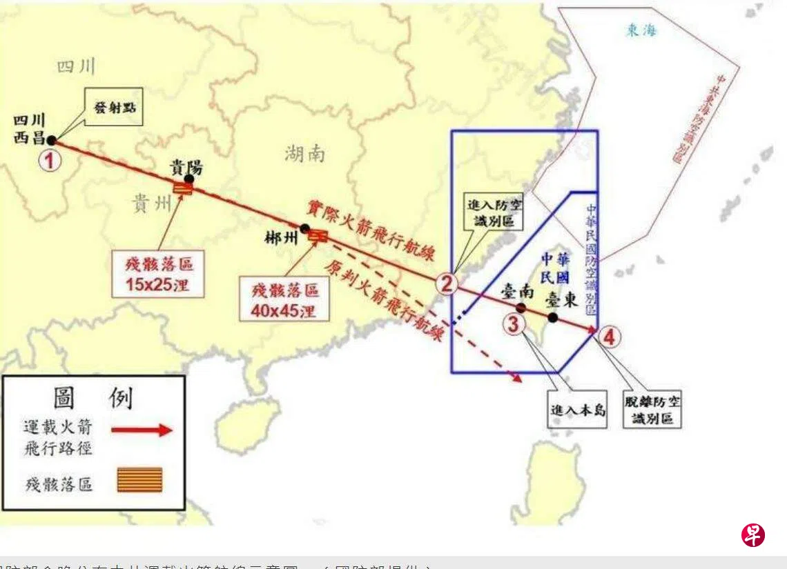 综合自由时报和联合报报道,台湾国防部星期二晚以录制影片方式回应“国家级警报”。台国防部情次室次长颜有贤说,台湾军队星期二下午3时3分侦获大陆西昌卫星发射中心发射的长征型火箭,依据美国联邦航空管理局所公布的飞行航线图,是会进入台湾西南空域,但不会经过台湾本岛上空,但该枚火箭经过湖南郴州之后的轨迹异常,随后进入台湾防空识别区通过台南、台东上空,再脱离台防空识别区。