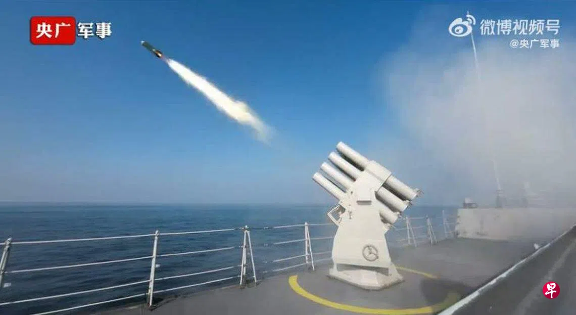 视频显示,几艘舰艇向空中发射多枚舰炮。