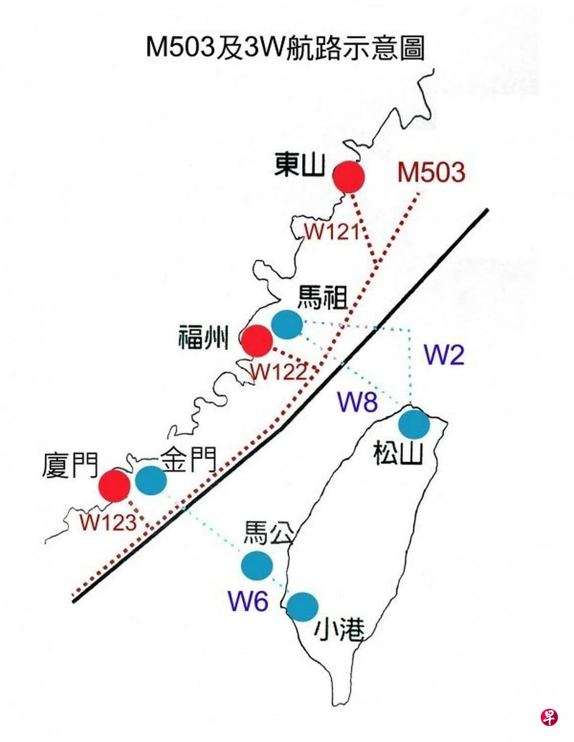 M503航线是中国大陆在2015年马英九政府时期在台海中线西侧划设的新国际民航路线,距离台海中线4.2海里。M503航线的调整,意味着大陆民航航班将更贴近台海中线,通过W122、123由西向东的飞行方向面朝台湾,对台湾进一步施压。