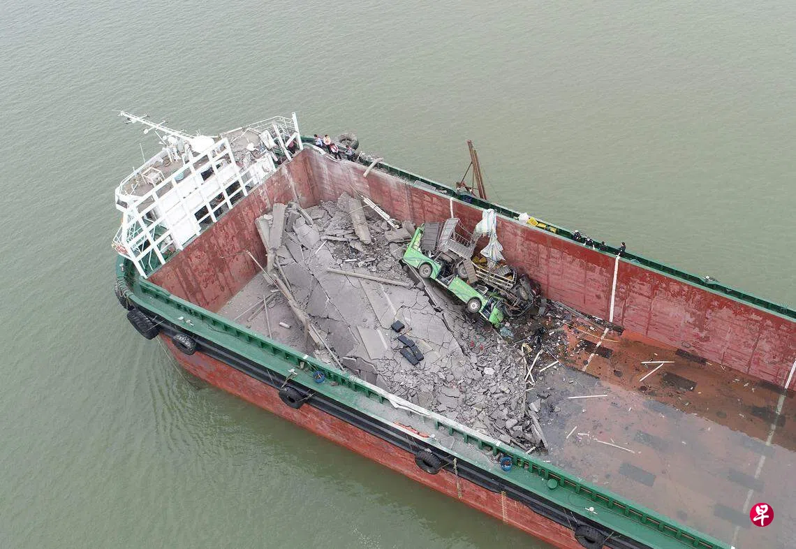 经核实,共有四辆车和一辆电动摩托车从断裂处坠落,其中一辆空载中巴车、一辆货车和一辆电动摩托车坠落到“良辉688”船舱内,两辆小货车掉落水中。该事故造成五人死亡,即空载中巴车驾驶员一人、电动摩托车驾驶员一人、落水小货车三人,两人在医院救治,目前生命体征稳定;肇事船舶一名船员轻微伤。