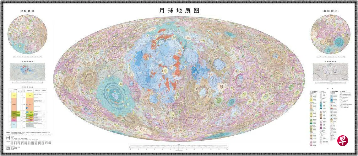 此次发布的图集和说明书采用中英文双语编制,其中主图《1:250万月球全月地质图》利用青、黑、黄、品红四个基色叠印出共150种颜色,对月球进行“三宙六纪”的地质年代划分;识别并标记全月12341个撞击坑、81个撞击盆地、17种岩石类型、14类构造,建立了统一的盆地建造亚类的分类体系。