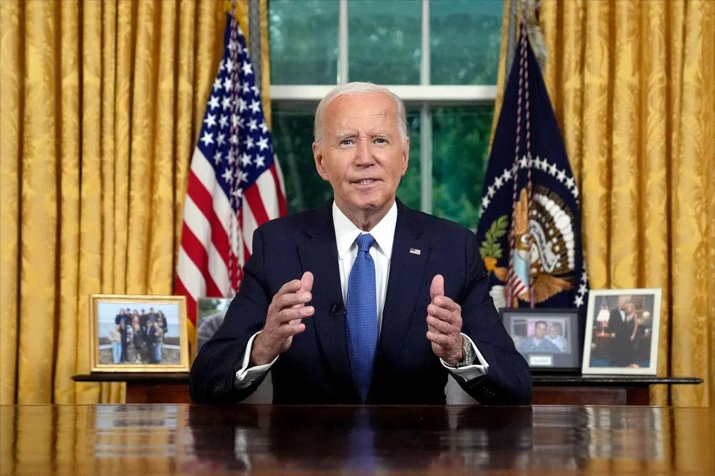 拜登7月21日宣布退选2024年美国总统选举,7月24日在白宫椭圆形办公室向全国民众发表讲话,解释退选原因。