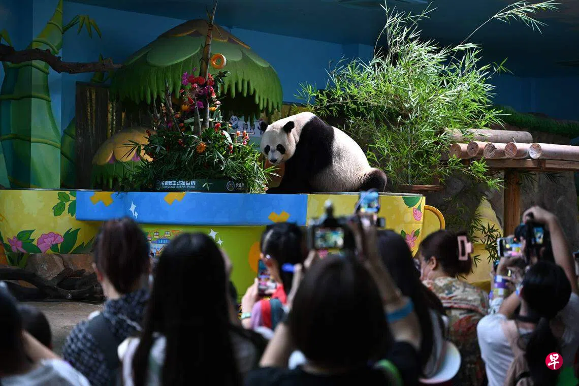 随着特制生日蛋糕被送到“寿星”们面前,特邀嘉宾与游客一起唱起生日歌,“萌帅酷”在祝福中开启现场“吃播”。保育员介绍,生日蛋糕是由蜂蜜水、水果块、竹笋、胡萝卜和竹子等食材制作而成,兼顾健康与美味。