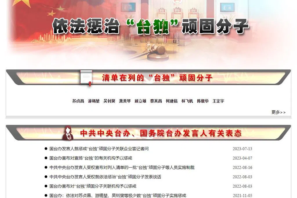 中国大陆国台办和公安部官网8月7日新增惩治台独专栏,名单中包括苏贞昌、游锡堃、吴钊燮、萧美琴、顾立雄、蔡其昌、柯建铭、林飞帆、陈椒华、王定宇等10人。