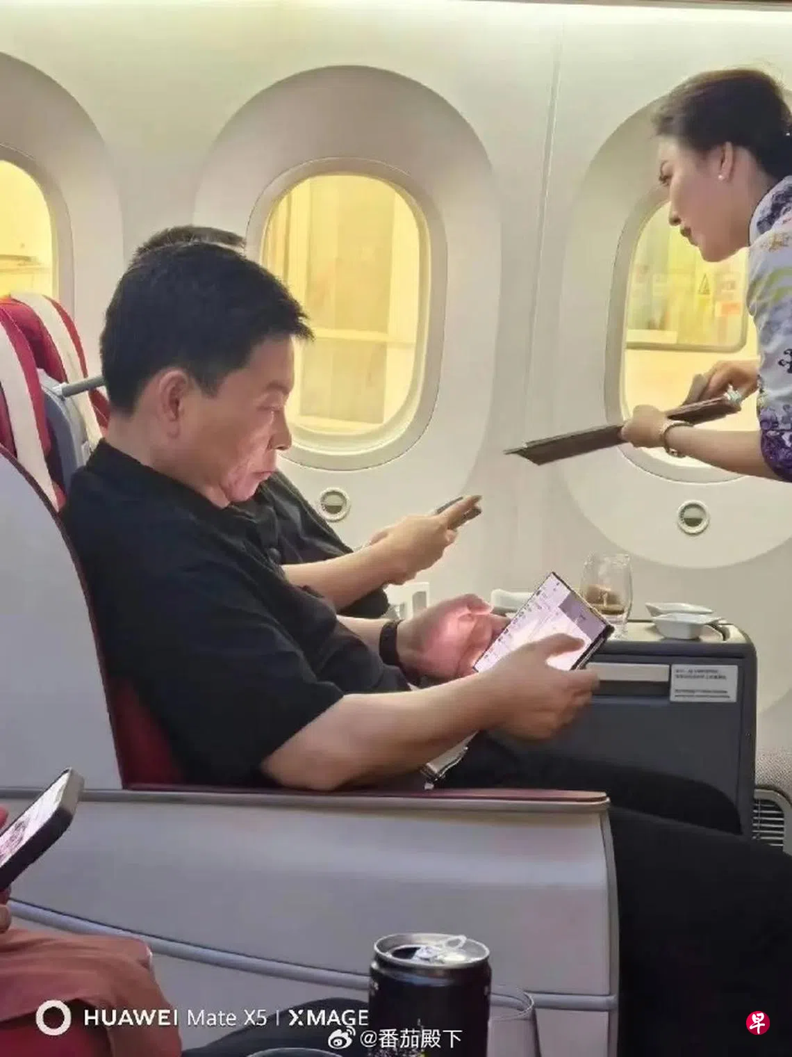 综合观察者网、每日经济新闻等报道,多名中国数码博主星期五(8月9日)在社交媒体上传余承东在飞机商务舱操作手机的图片,图片中的手机有两条折痕,不少博主猜测该手机是华为尚未公布的三折屏新机。
