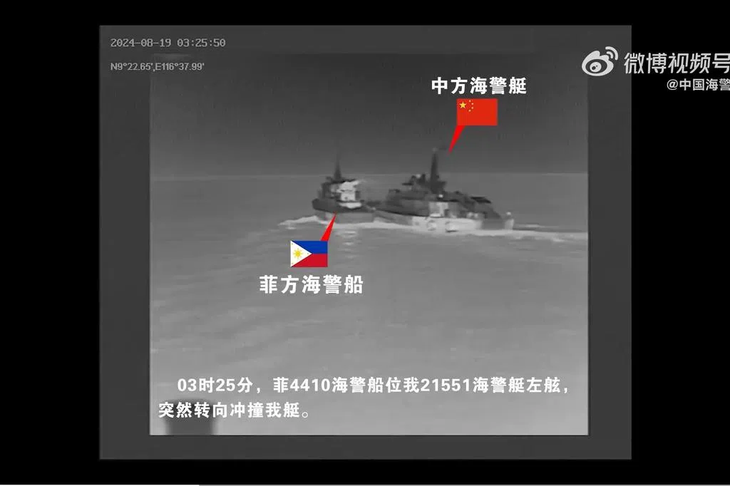 中菲两国海警船星期一(8月19日)凌晨在南中国海相撞。中国外交部称,菲方海警船擅自闯入南沙群岛仙宾礁(菲称萨比纳礁)邻近海域,不顾劝阻和警告,以危险方式故意冲撞现场执法的中国海警船,造成双方船只发生碰撞的责任完全在菲方。