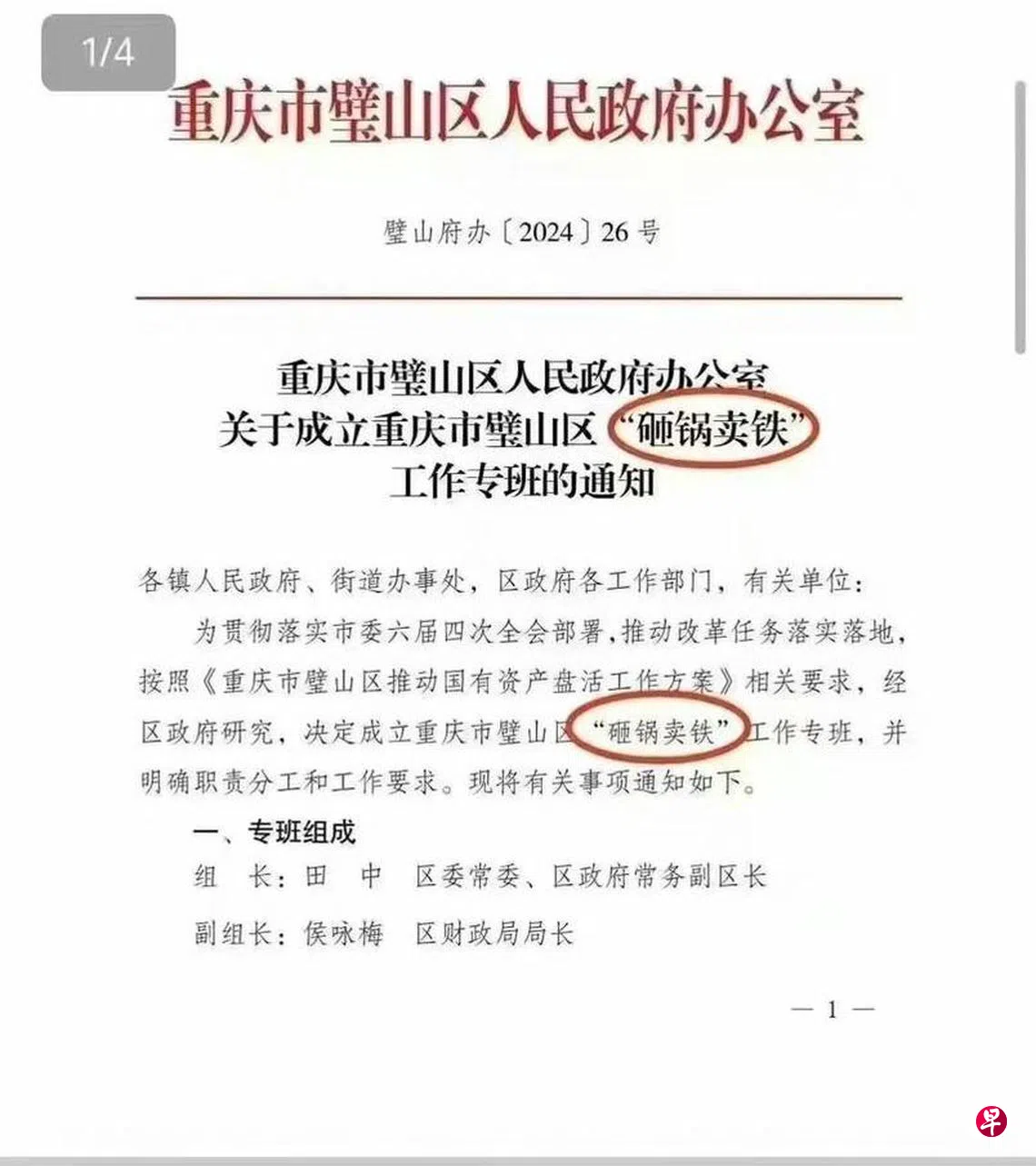图片中还明确了专班的组成。组长为璧山区区委常委、区政府常务副区长田中;两名副组长为区财政局局长侯咏梅、区国资中心主任韩艳。璧山政府官网显示,这三人确实是该区领导干部。