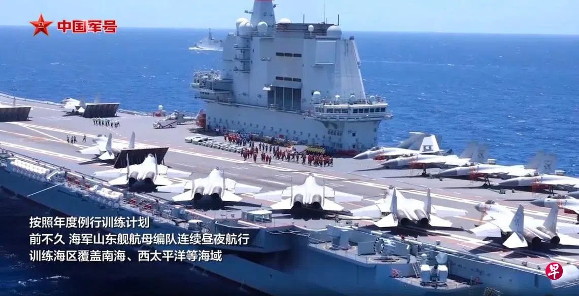 中国官媒报道,按照年度例行训练计划,中国解放军山东舰航母编队不久前展开训练,训练海区覆盖南中国海、西太平洋等海域。