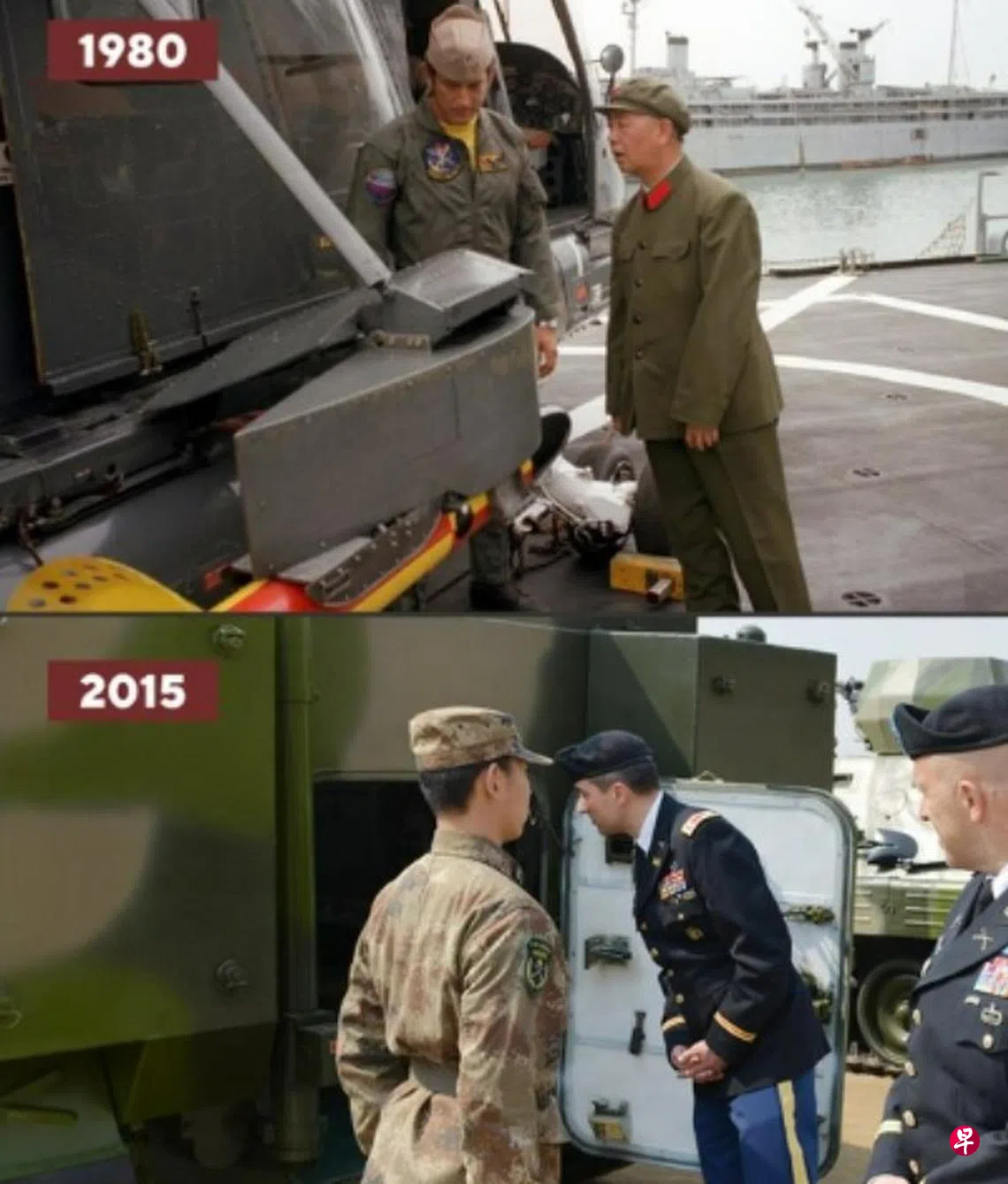 这组名为“看与被看”的对比照片中,上图是时任解放军副总参谋长的刘华清1980年在美国参观美国航母,下图则是2015年3月,美国国防大学代表团前往沈阳军区参观装备。