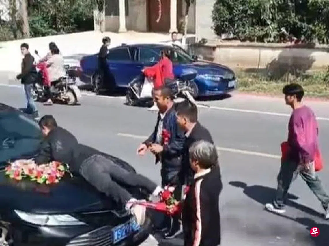 河南在“十一”中国国庆当天发生一起婚礼闹剧,新郎到新娘家接亲时突然被女方家人要求多付18万8000元(人民币,下同,3万4734新元)彩礼,否则不准新娘出嫁,气得新娘子跑上天台企图跳楼。新郎把新娘拉上婚车后,新娘兄长更以人肉挡车,爬上婚车车头及睡在车底,造成围观,事件引发网络关注,让彩礼问题再度进入公众视野。