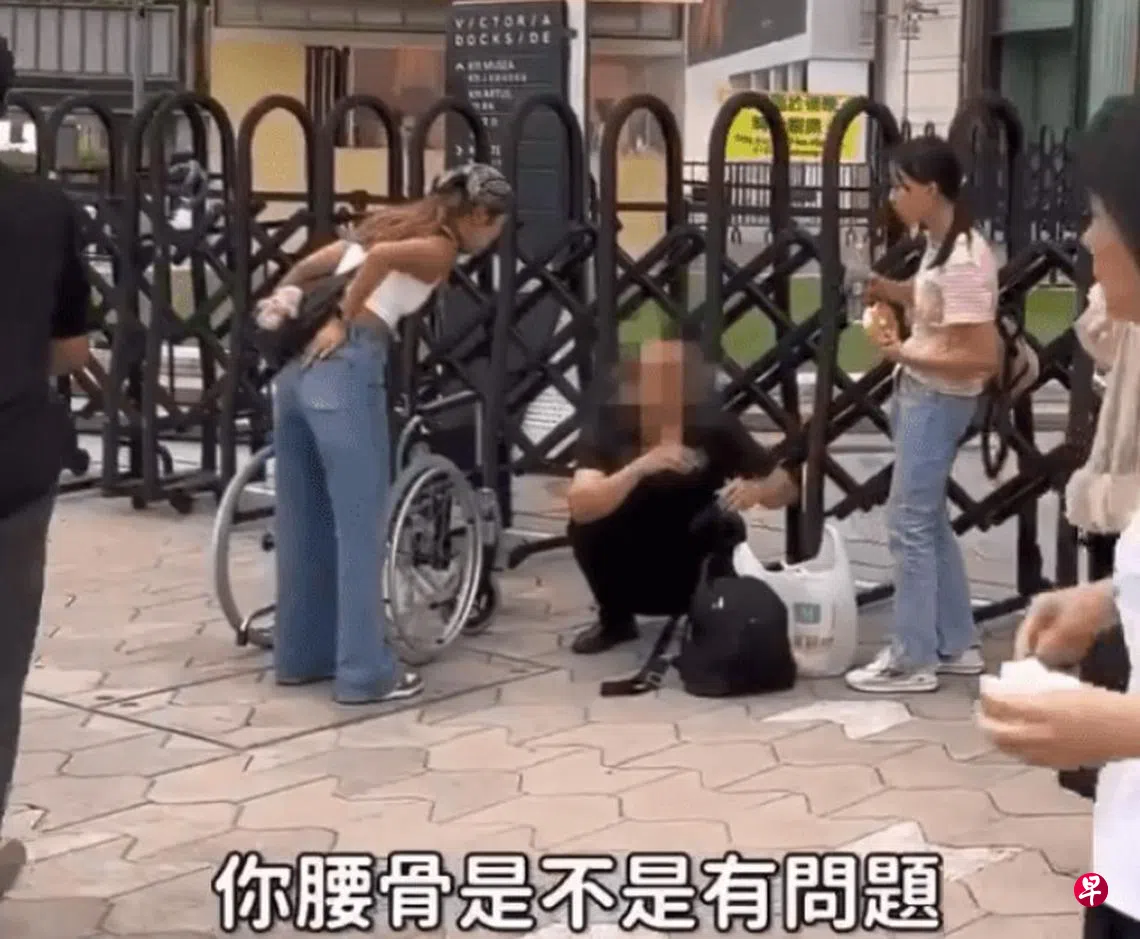 视频显示,二人在香港尖沙咀星光大道,询问了五到六名蹲在地上的大陆游客:“我看你蹲了好久,是不是腰椎有问题,要不要坐轮椅?”语气疑似嘲笑对方。