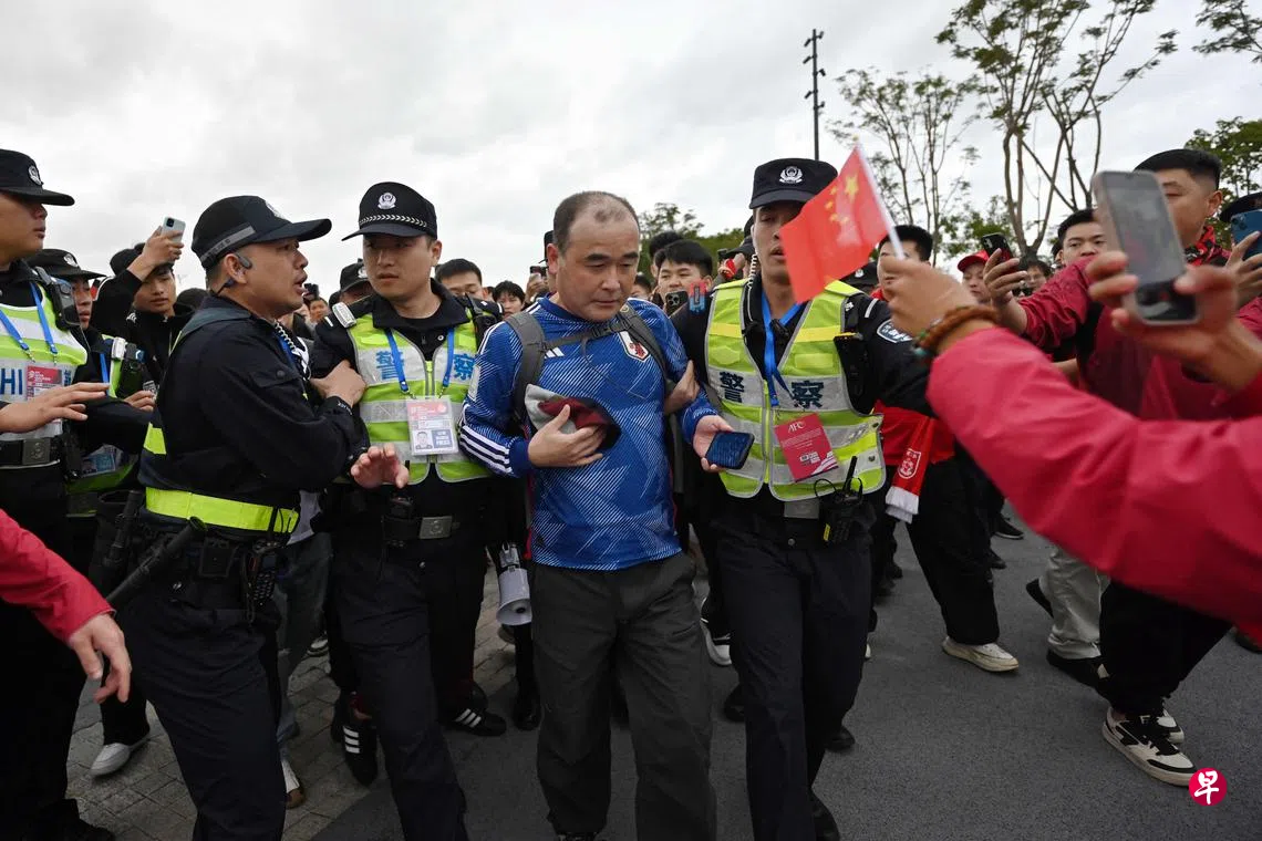 据报道,一名身穿中国球衣男子冲出,推撞穿日本队服男子,后者低头避开。随后有保安协助穿日本队服男子离开现场。