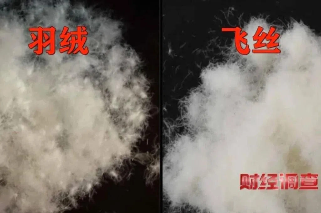 所谓“飞丝”,是指羽绒加工过程中从羽毛上脱落下来的单根短丝,形态与羽绒有相似之处,从外观看或是用手触摸,消费者难以分辨差异。