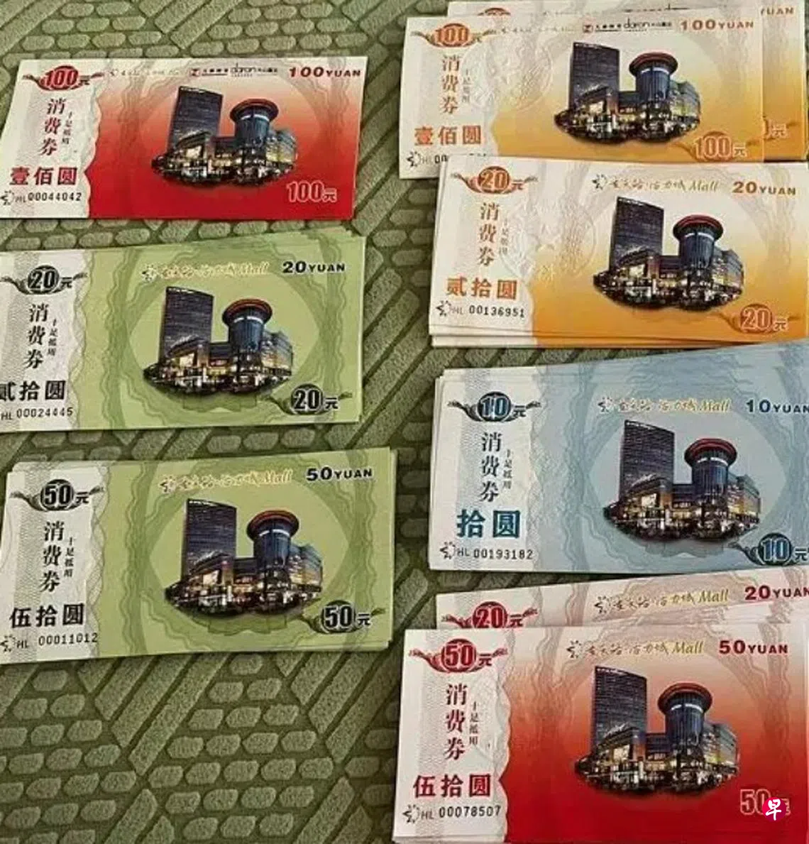 视频显示,上述员工得到的彩印消费券面值有5元(人民币,下同,0.93新元)、10元、20元、50元和100元,还有编印号码,印有“重庆路·活力城Mall”“大众置业”等字样。