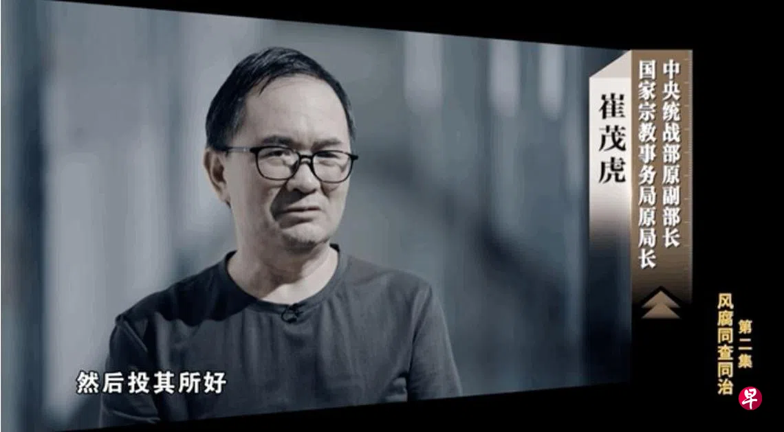 中共中央统战部原副部长、国家宗教事务局原局长崔茂虎,去年7月因受贿罪被辽宁沈阳法院判入狱11年。官方电视专题片《反腐为了人民》星期一(1月6日)晚播出第二集《风腐同查同治》,讲述崔茂虎在担任丽江市委书记期间,沉迷打牌成公开秘密,被商人利用。