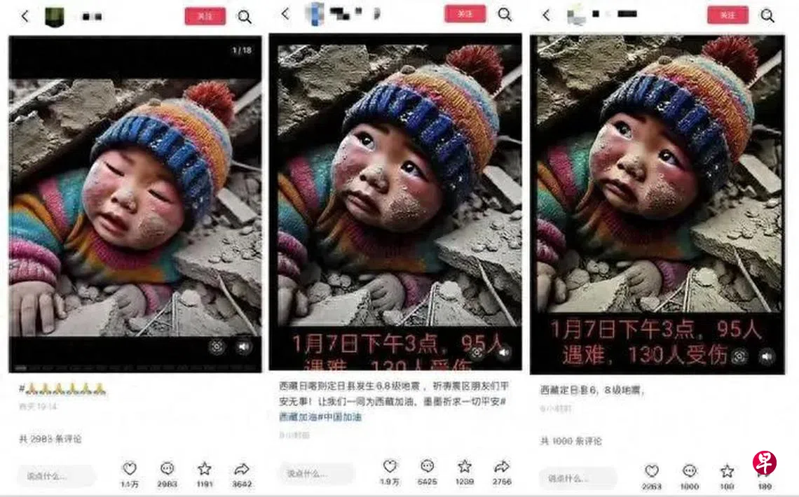西藏定日县地震发生后,一组“小男孩被埋图”在中国网络平台传播,警方发现该图片原本由AI工具创作,但被一名网民与此次地震相关信息进行关联拼凑,以博取流量,涉案网民已被警方行政拘留。