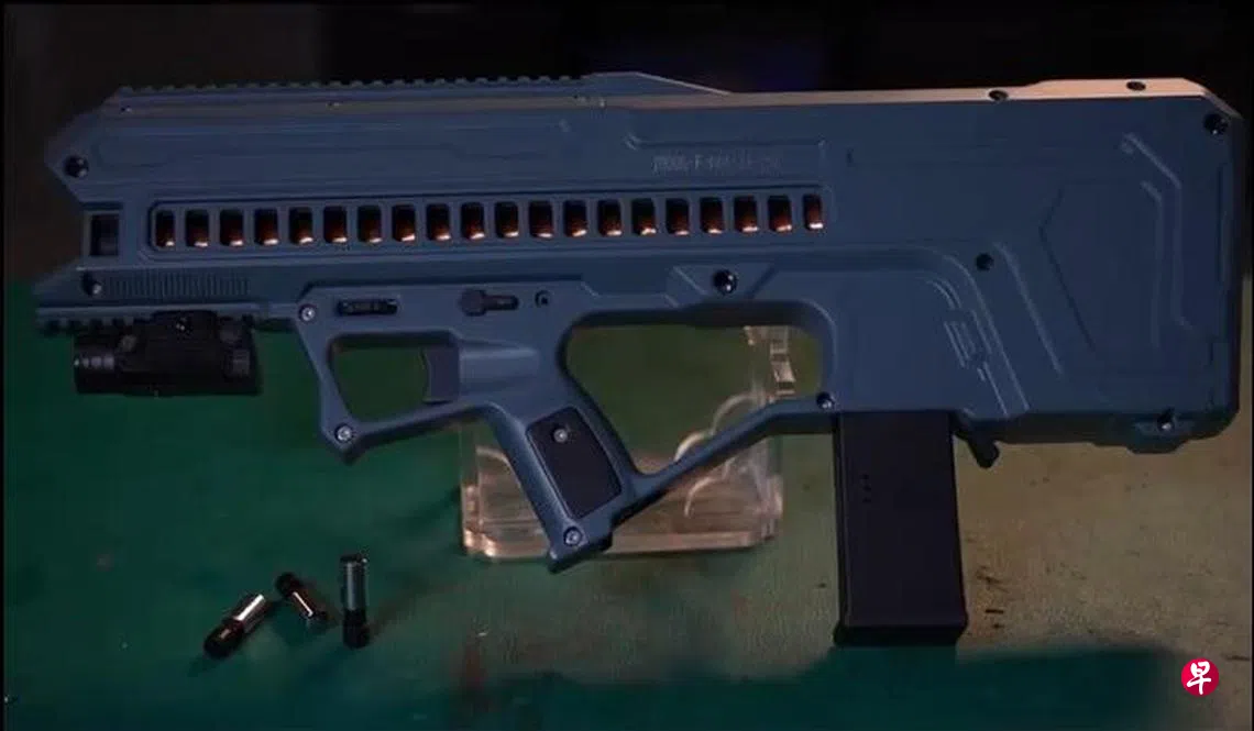 视频显示,电磁枪的握把设置在中部,弹匣在后方,前部搭载激光指示器。顶部除导轨外还配有电子显示屏,在实际射击过程中可显示电量、剩余弹药数量、模式等信息。这款电磁枪可调节不同功率,支持切换连发和单发模式。