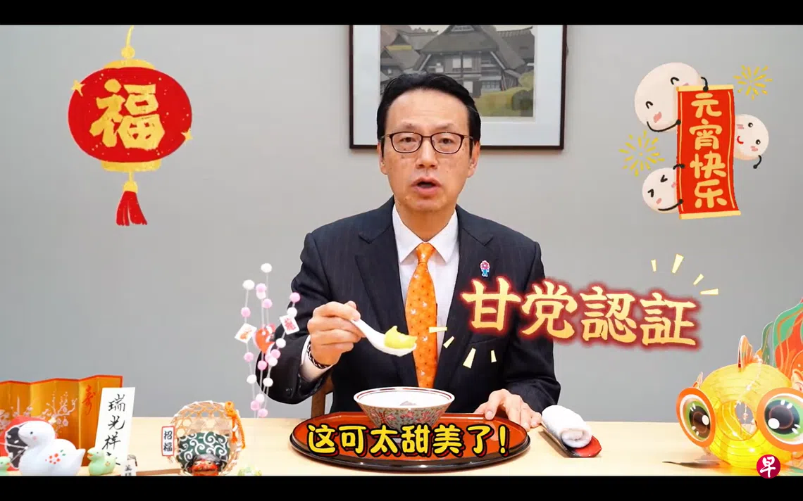 “嗯,真的很甜,里面有芝麻。”日本驻中国大使金杉宪治在使馆官邸品尝过不同口味的汤圆后,笑着用日语对镜头说:“果然还是喜欢甜的。”
