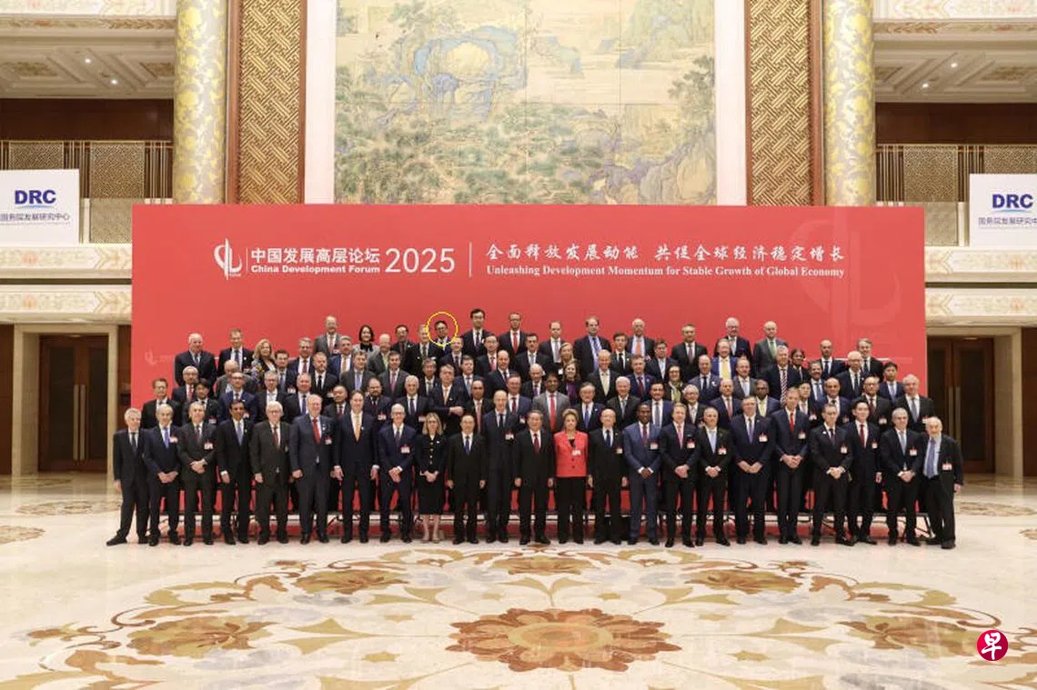 据中新社发布的照片显示,李泽楷站在大合照的最后一排,在活动宣传板的标语“2025”的下方。